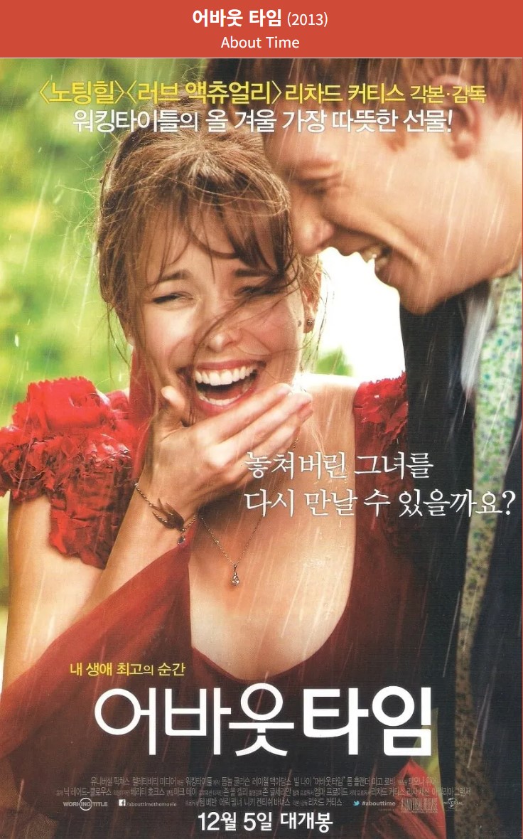시간여행을 소재로 한 영화들은 대개 웅장한 스케일이나 복잡한 플롯을 중심으로 전개됩니다. 하지만 <어바웃타임>은 시간여행을 "일상의 행복을 되돌아보는 도구"로 사용하며 독특하고 차별화된 접근을 선보였습니다.