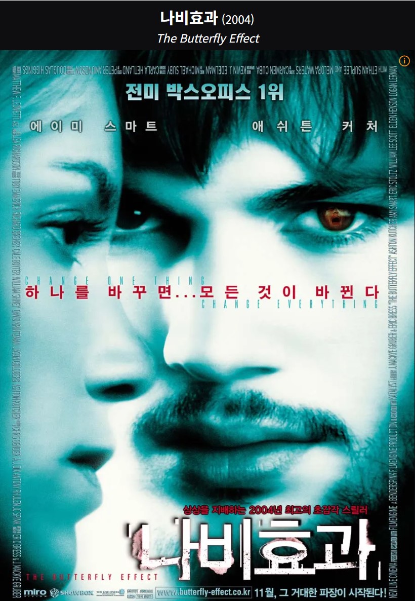 바꿀 수 없는 과거를 후회하며 낭비하기엔 지금 당장 우리가 만들어가야 할 미래가 너무나 많으니까요. 시간 여행이라는 매력적인 소재와 퍼즐처럼 딱딱 맞아떨어지는 치밀한 시나리오, 그리고 머리를 댕~ 치게 만드는 소름 돋는 메시지까지! 주말 저녁, 몰입감 200%의 짜릿한 스릴러가 당기신다면 영화 '나비효과'를 강력하게 추천해 드립니다!